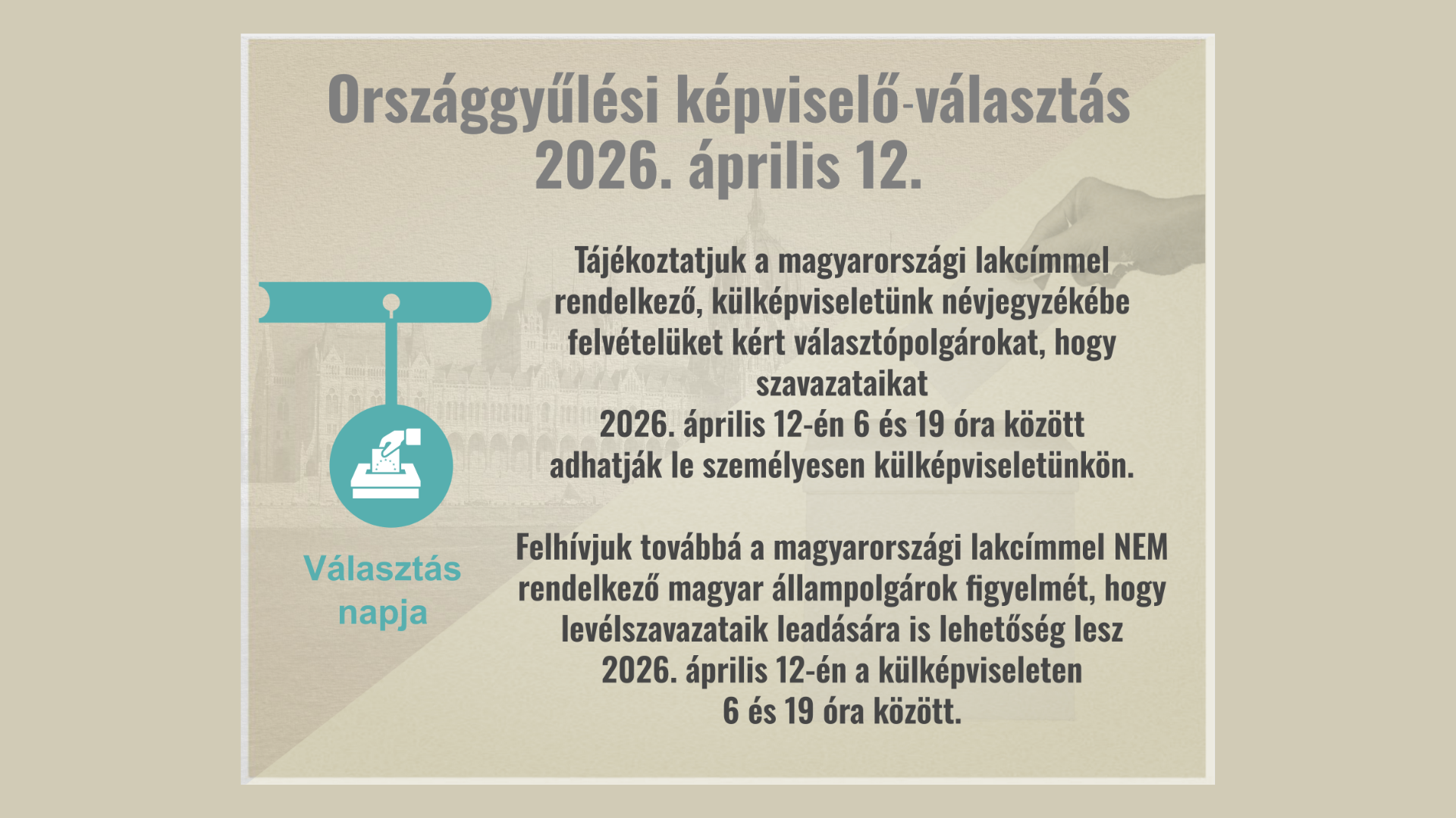 Magyarországi lakcímmel rendelkező, szavazóköri névjegyzéken szereplő választópolgárként, amennyiben külképviseleten kíván szavazni az adott választás tekintetében, külképviseleti névjegyzékbe vételi kérelmet nyújthat be 2026. április 2-án 16.00 óráig.
